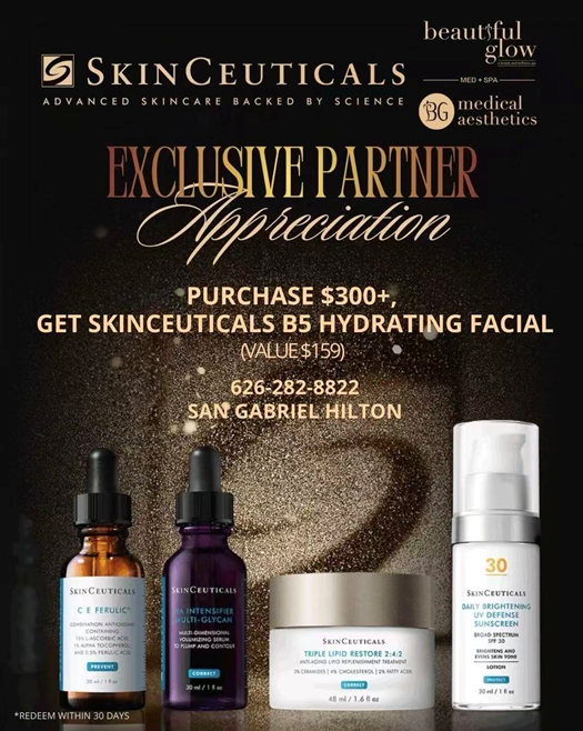 To celebrate this exclusive SkinCeuticals partnership, BG Medical Aesthetics & Beautiful Glow are offering a limited-time Partner Appreciation promotion for our SkinCeuticals clients in San Gabriel and Los Angeles.